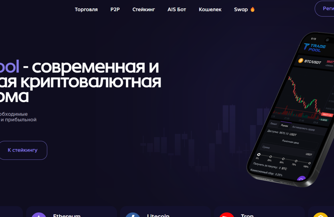 На сайте Trade Pool размещена реклама собственных услуг и предполагаемых достижений, но отсутствует информация, подтверждающая их законность или реальность успехов. Платформа состоит из нескольких разделов с шаблонным контентом, баннерами и ссылками на возможные связанные проекты, которые также вызывают сомнения.